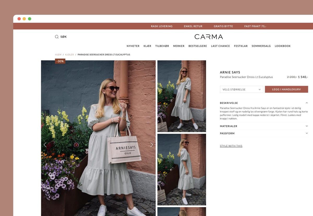 For Carma har vi utviklet funksjonalitet som løser akkurat dette. Kunder kan enkelt se alle produktene som modellen har på seg i seksjonen "Style with this" og legge hele antrekket til i handlekurven med et enkelt klikk. For kunder innebærer dette en rask og enkel handel, mens for Carma betyr det økt kundetilfredshet og bedre automasjon i kundebehandlingen. For ikke å glemme at dette er en glimrende mulighet for mersalg!